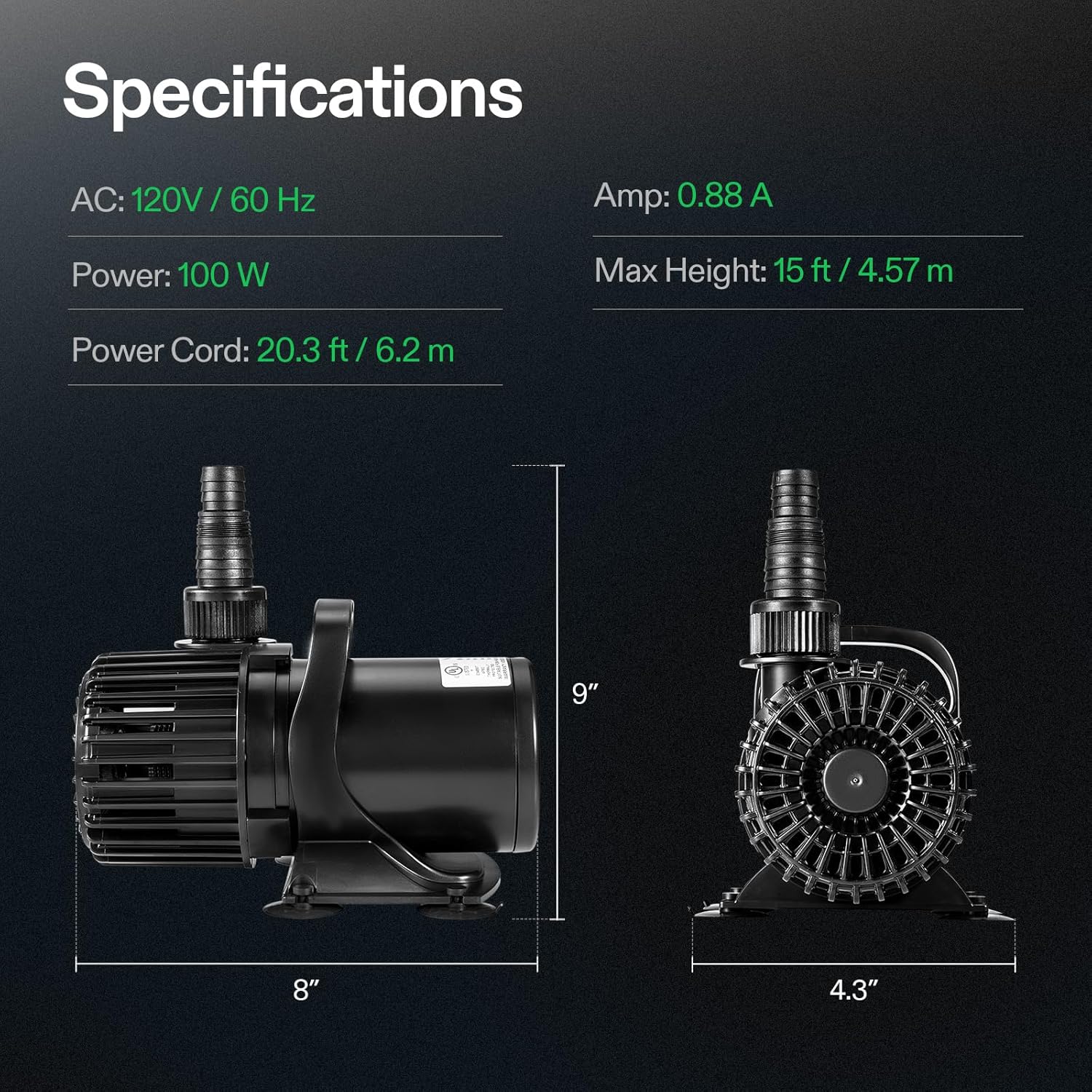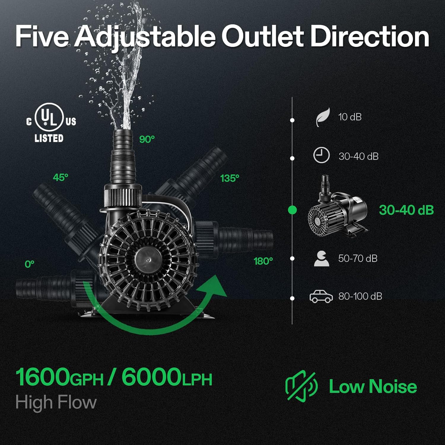 - Energy Saving with Low Noise: Ultra-quiet operation design(30-40db); Less power(100W) consumption with high output(1600GPH/6000LPH) which compared to other pumps; Fits for 264 Gallon Pond