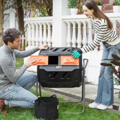 - Twin chambers: Two separate chambers allow one side to finish composting while leaving the other side available to add fresh wastes; Constant alternation of the two sides will create an uninterrupted stream of nutritious compost