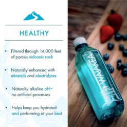 Waikea volcanic water originates in Hawaii through both snowmelt and rain on the pristine peak of the active Mauna Loa volcano — one of the purest environments on Earth. It’s then filtered through 14,000 feet of porous volcanic rock, enhancing it with minerals and electrolytes to make it naturally alkaline with a pH of 8.8, and smooth to taste with a hint of sweet.