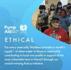 - CHARITABLE: For every liter of Waiakea you buy, Waiakea donates 1 week’s supply of clean water to those in need in Africa and throughout the world, through our incredible partner, Pump Aid