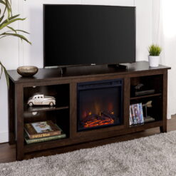 Display your TV in style with this 58-inch TV stand and electric fireplace. Crafted from high-grade MDF with a durable laminate finish for a rich, textured surface, this storage console features two adjustable shelves on both sides of the fireplace for anything from your electronics to your home decor. With a cord management port at the back of each shelving space, you’ll never have to worry about a tangled mess of wires as it’ll keep them organized. This entertainment center mixes a traditional style with the on-trend rustic farmhouse look with its simple design and will be a classic piece to your living room. This media stand will accommodate most flat-panel TVs up to 64 inches. Installation for the fireplace requires no technician, simply plug into any standard household outlet.
