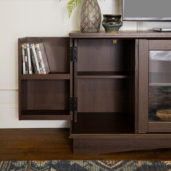 Perfect for your bedroom or living room, this 52 inch media console is a necessity for your family’s entertainment. This entertainment center is crafted from laminate and high-grade MDF with a warm and textured finish, it will support a TV up to 55 inches. This TV stand features four cabinets, with the two end cabinets which can extend out to give you additional storage space containing two shelves on each door, while the two glass and metal middle doors open with an adjustable center shelf, all to provide ample storage space for your media and accessories. The combination of simple, round metal hardware on each door, high-grade MDF composition, and laminate surface create a traditional design. Fits up to a 55 inch TV.