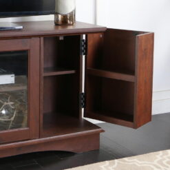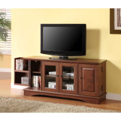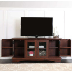 Perfect for your bedroom or living room, this 52-inch media console is a necessity for your family’s entertainment. This entertainment center is crafted from laminate and high-grade MDF with a warm and textured finish, it will support a TV up to 58 inches. This TV stand features four cabinets, with the two end cabinets which can extend out to give you additional storage space containing two shelves on each door, while the two glass and metal middle doors open with an adjustable center shelf, all to provide ample storage space for your media and accessories. The combination of simple, round metal hardware on each door, high-grade MDF composition, and laminate surface create a traditional design.