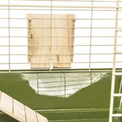 This unique eco-friendly home Features all natural removable wood shelves, ramps and hay feeder. Multiple levels of living space. The cage is easy to assemble with no tools required You can simply snap and go. The extra deep base reduces mess and is easy to clean. Wood is made of pine and is safe to chew. Clean natural Wood surfaces with a 50/50 mix of water and white vinegar. Lightly mist a cloth and wipe shelves and ramps to clean. Allow to dry and replace. This is a non-toxic solution that helps remove stains and eliminates odor.