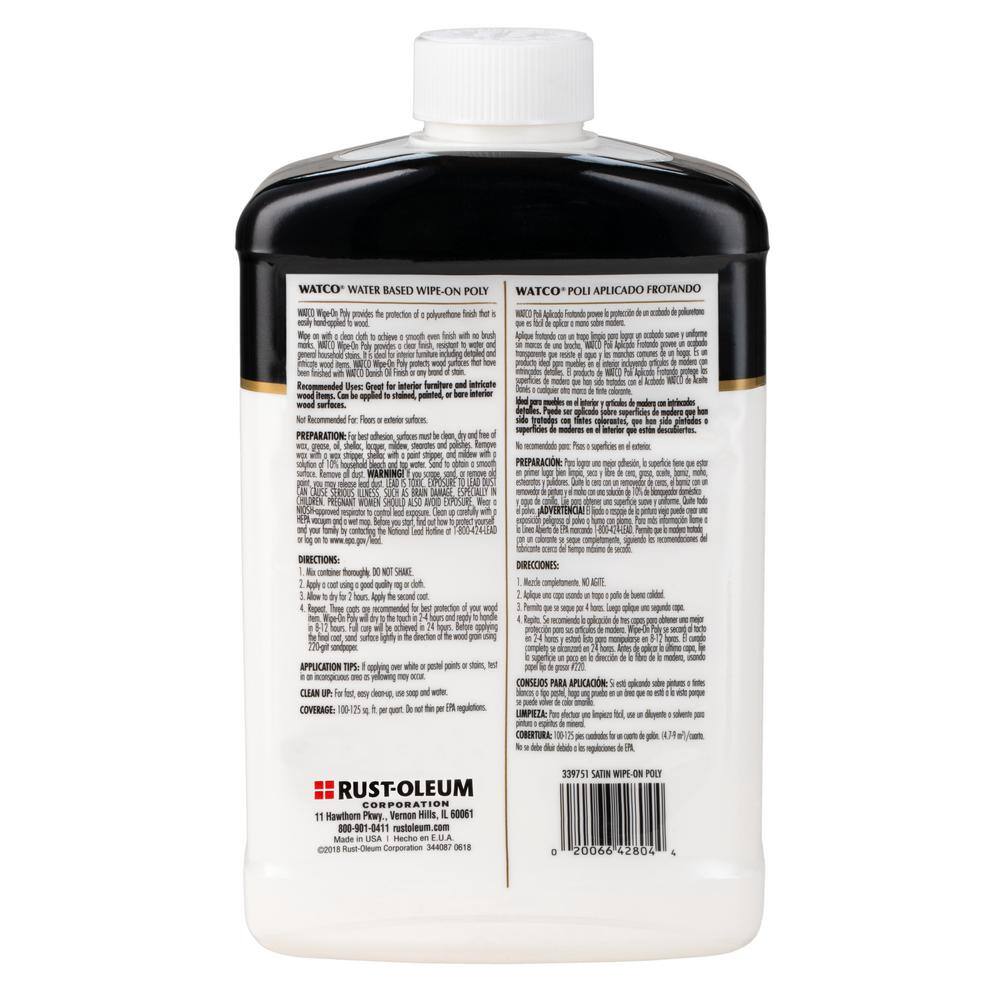 Watco 1-qt. Satin Wipe-On Polyurethane provides the protection of a polyurethane finish in a formula that is hand-applied and wiped onto wood. Wipe on surfaces to get into areas that are difficult to reach with traditional brush-on polyurethane. Clear finish protects wood furniture and other interior wood surfaces from water, liquids, chemicals, stains and other wear from use.