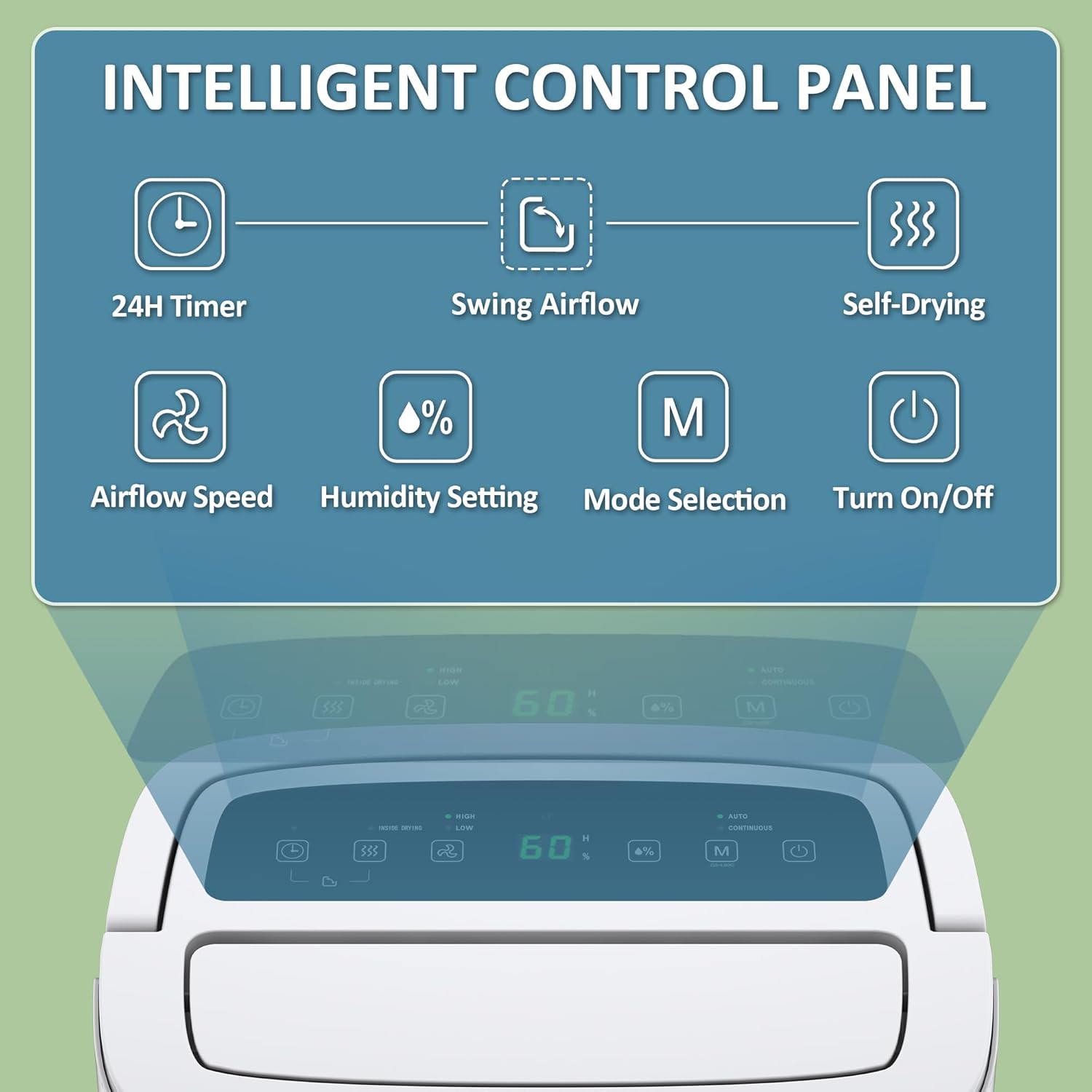 - 【Easy to Operare & Control Lock】 By integrating a smart control panel, the dehumidifier allows you to control the unit in an easy manner. The humidity reading display helps maximize the convenience to monitor the humidity, adjust the humidity level, set the timer. Simply adjust to your ideal moisture, it will smartly sense room humidity and control dehumidification to maintain pre-set humidity levels.Control locks help to avoid potential hazards caused by inadvertent operation.