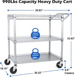 - 990Lbs Capacity & Anti-Rust : WDT This Commercial Grade Rolling Utility Cart is constructed from high quality industrial strength metal, and equipped with 1 inch diameter poles. Can hold up to 990lbs on wheels. This kitchen utility cart metal surface with anti-rust chrome plated, it will not rust make it easy to clean.