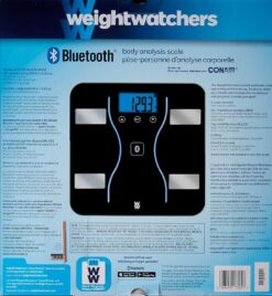 Weight Watchers by Conair Glass Bluetooth Body Analysis Bathroom Scale; Measures Body Fat, Body Water, Bone Mass, Muscle Mass, and BMI; 9 User Memory; High Visibility Back Lit LCD; Blue Accent Light; Connect via Bluetooth to the WW Scales by Conair App; Bluetooth WW Bath Scale; Black Tech