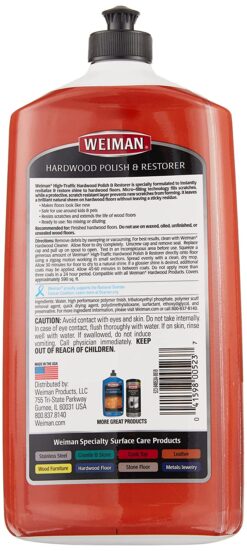 Weiman Wood Floor Polish and Restorer – 32 Ounce – High-Traffic Hardwood Floor, Natural Shine, Removes Scratches, Leaves Protective Layer, Packaging May Vary. Weiman Hardwood Floor High Traffic Polish & Restorer instantly rejuvenates floors with a brilliant, natural suppleness & sheen that extends the life of wood floors while leaving them looking like new. It doesn’t just fade existing scratches, it contains a micro-filling technology that prevents new ones from forming!