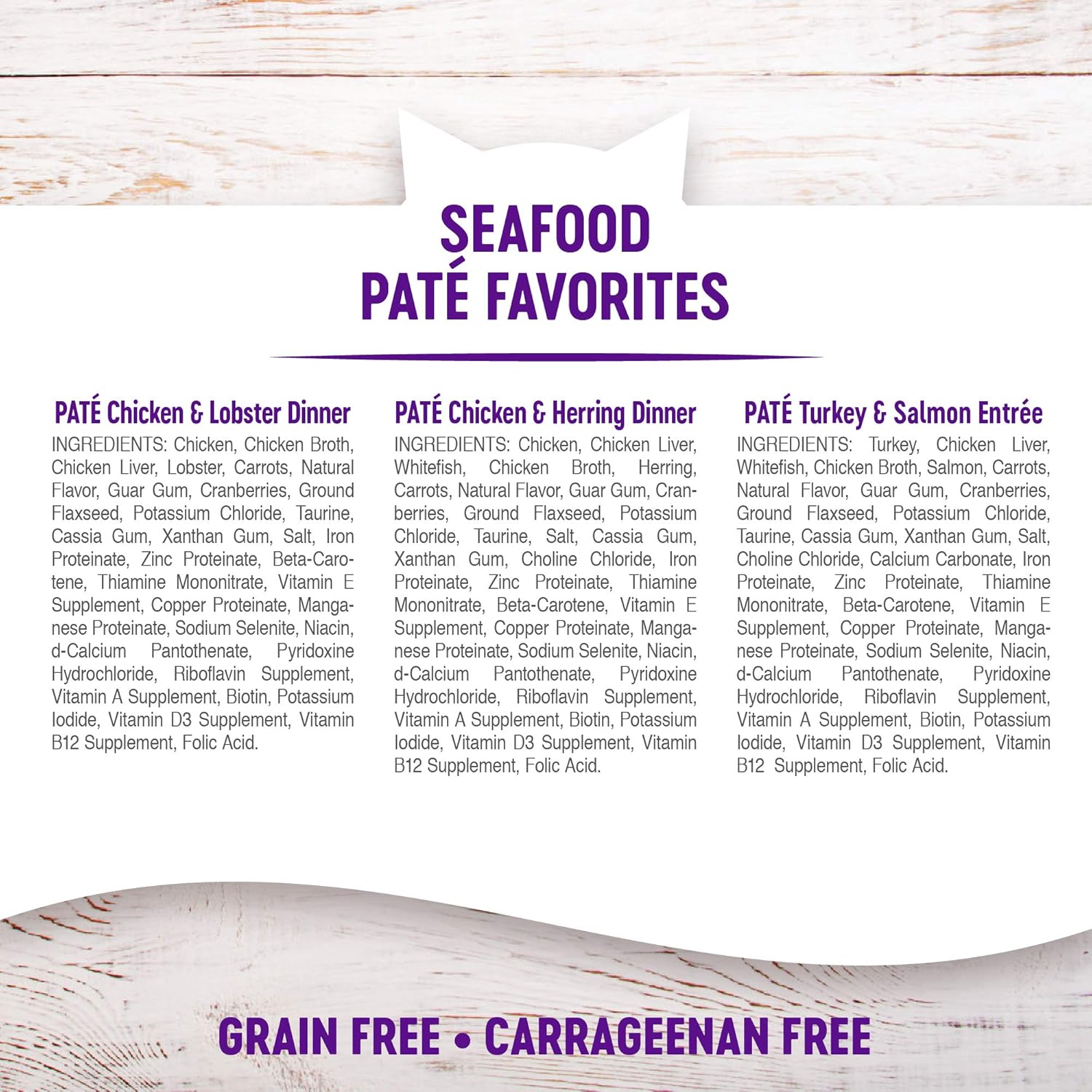 Chicken & Herring Pate: Chicken, Chicken Liver, Chicken Broth, Whitefish, Herring, Chicken Hearts, Carrots, Natural Flavor, Ground Flaxseed, Cranberries, Dried Chicory Root, Potassium Chloride, Guar Gum, Taurine, Fish Oil (Preserved With Mixed Tocopherols), Sunflower Oil, Cassia Gum, Xanthan Gum, Choline Chloride, Salt, Vitamin E Supplement, Zinc Proteinate, Iron Proteinate, Tricalcium Phosphate, Thiamine Mononitrate, Beta Carotene, Copper Proteinate, Manganese Proteinate, Sodium Selenite, Niacin Supplement, d-Calcium Pantothenate, Pyridoxine Hydrochloride, Riboflavin Supplement, Vitamin A Supplement, Biotin, Potassium Iodide, Vitamin D3 Supplement, Vitamin B12 Supplement, Folic Acid. Turkey & Salmon Pate: Turkey, Whitefish, Chicken Liver, Chicken Broth, Salmon, Chicken Hearts, Carrots, Natural Flavor, Ground Flaxseed, Guar Gum, Cranberries, Dried Chicory Root, Cassia Gum, Xanthan Gum, Potassium Chloride, Taurine, Fish Oil (Preserved With Mixed Tocopherols), Sunflower Oil, Choline Chloride, Salt, Vitamin E Supplement, Zinc Proteinate, Iron Proteinate, Tricalcium Phosphate, Thiamine Mononitrate, Beta Carotene, Copper Proteinate, Manganese Proteinate, Sodium Selenite, Niacin Supplement, d-Calcium Pantothenate, Pyridoxine Hydrochloride, Riboflavin Supplement, Vitamin A Supplement, Biotin, Potassium Iodide, Vitamin D3 Supplement, Vitamin B12 Supplement, Folic Acid. Chicken & Lobster: Chicken, Chicken Broth, Chicken Liver, Lobster, Chicken Hearts, Carrots, Natural Flavor, Fish Oil (Preserved With Mixed Tocopherols), Cranberries, Dried Chicory Root, Ground Flaxseed, Guar Gum, Potassium Chloride, Taurine, Sunflower Oil, Cassia Gum, Xanthan Gum, Choline Chloride, Salt, Vitamin E Supplement, Zinc Proteinate, Iron Proteinate, Tricalcium Phosphate, Thiamine Mononitrate, Beta Carotene, Copper Proteinate, Manganese Proteinate, Sodium Selenite, Niacin Supplement, d-Calcium Pantothenate, Pyridoxine Hydrochloride, Riboflavin Supplement, Vitamin A Supplement, Biotin, Potassium Iodide, Vitamin D3 Supplement, Vitamin B12 Supplement, Folic Acid