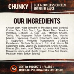 - CHUNKY BEEF AND CHICKEN: All-natural wet food delivers what your cat craves. Protein-rich recipe features chunks of beef and chicken in a delicious sauce that supports daily hydration. We recommend serving at room temperature for maximum palatability.