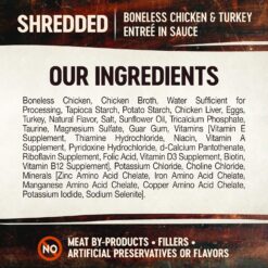 - SHREDDED CHICKEN AND TURKEY: All-natural wet food delivers what your cat craves. Protein-rich recipe features delicate shreds of chicken and turkey in a delicious sauce that supports daily hydration. We recommend serving at room temperature for maximum palatability.