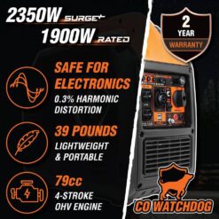 The WEN 2350-Watt Inverter Generator provides clean energy, free of voltage spikes and drops, without all the noise of a regular generator. Produce up to 2350 surge watts and 1900 rated watts of power. The WEN Watchdog CO Shutdown Sensor helps protect both you and your family by automatically turning off the generator if dangerous levels of carbon monoxide are detected. Our 79cc 4-stroke OHV engine operates at an extremely quiet 51 decibels at quarter load, quieter than a window air conditioner or the average conversation. The WEN 2350W Inverter Generator is also equipped with fuel shutoff. This feature turns off the flow of fuel, allowing for the generator to use up the remaining fuel from the carburetor before automatically shutting down. Designed to mirror a pure sine wave, this generator limits total harmonic distortion to under 0.3% at no load and under 1.2% at full load. The lightweight 39 lbs. design makes for easy portability while the ultra-efficient 1 Gal. tank provides over 5.7-hours of half-load run time. The fully-packed panel comes equipped with 2, 3-prong 120-Volt 14 Amp NEMA 5-20R receptacles, one 12-Volt 8.3A DC receptacle and two 5-Volt USB ports. Maximize fuel economy by engaging the eco-mode switch. Need more energy. Easily link up any two WEN inverter generators using a WEN Parallel Connection Kit (sold separately) to share wattage amongst multiple units.