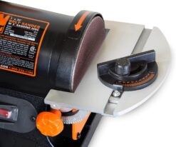 - Includes a miter gauge, an 80-grit sanding disc, a 100-grit sanding belt and a 2-year warranty