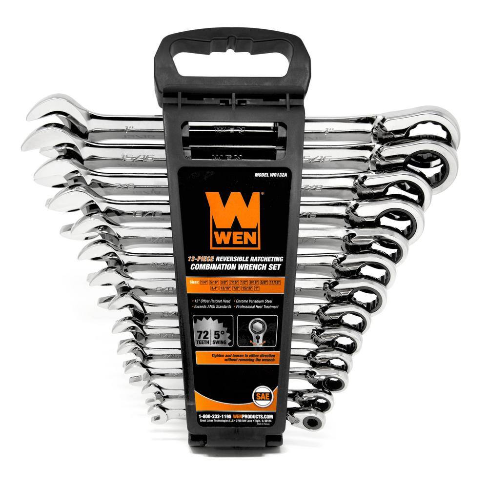 Remember when you had wrenches that lasted? Between the professional-grade, heat-treated, fully-polished chrome vanadium steel and the lifetime warranty, this WEN Combination Wrench set is the last wrench set you’ll ever have to buy. Our reversible ratchet design allows users to tighten or loosen in either direction with the simple flip of a lever. This set includes 13 different sized wrenches without skipping any sizes: 1/4 inch, 5/16 inch, 3/8 inch, 7/16 inch, 1/2 inch, 9/16 inch, 5/8 inch, 11/16 inch, 3/4 inch, 13/16 inch, 7/8 inch, 15/16 inch, and 1-inch wrenches. Each wrench features 72 internal ratcheting teeth for a 5-degree swing. The 15-degree offset ratchet head provides both finger clearance and easy access to hard-to-reach bolts. The included storage rack gives users a simple solution for organization and transportation, keeping your wrenches accessible whenever you need them. And because its a WEN product, if any of your wrenches ever break, just notify us and we’ll provide a replacement. Remember when you had the best of the best? Remember WEN.