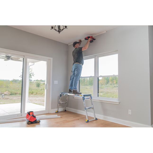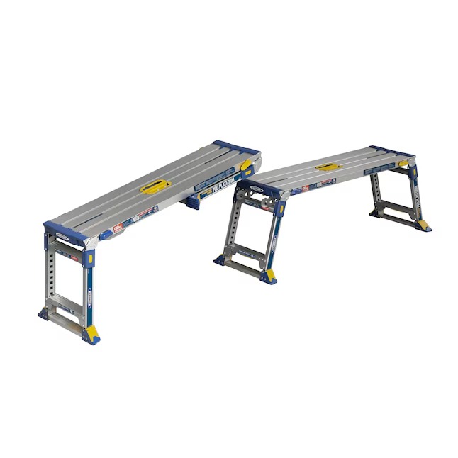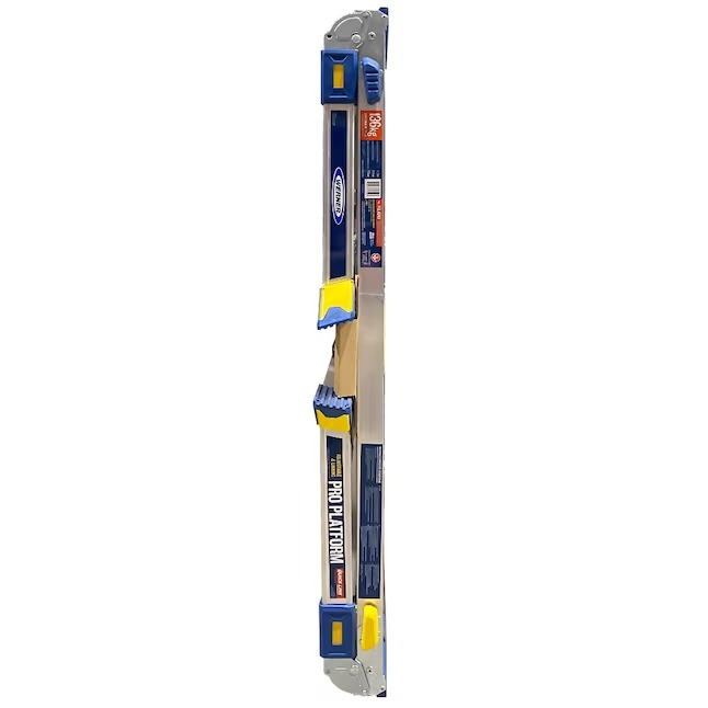 The AP-2030L Aluminum Adjustable Height and Linking Pro Platform 300lb Load Capacity is height adjustable and features a Quick Link technology, providing up to a 9ft reach and the ability to connect two or more platforms for longer working surface. The 47in x 14in work platform size is compact and lightweight, making it easier to transport. The Quick Link technology allows multiple platforms to be connected with no tools required. The work platform is fast to set up with one handed lock and height adjustments. The height adjustability and plastic bumpers allow for the Adjustable Pro Work Platform to be used on stairs without damaging finished surfaces. The wide feet provide stability without the need for manual adjustment.