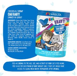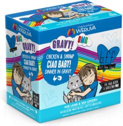 - B.F.F. OMG – Best Feline Friend Oh My Gravy!, Ciao Baby! with Chicken & Shrimp in Gravy Cat Food by Weruva, 2.8oz Pouch (Pack of 12)Ciao Baby! (2.8oz Pouch, Pack of 12) Red-meat tuna, cage-free chicken, and shrimp in a tasty gravy.