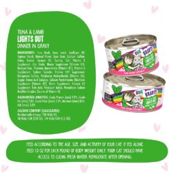 - Tuna & Lamb Lights Out (5.5oz Can, Pack of 8) Red-meat tuna, and grass-fed lamb in a tasty gravy.