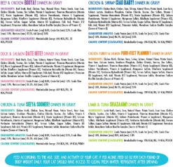 Date Night! Duck & Salmon Dinner in Gravy: 669 kcal/kg, 54 kcal/pouch; Shazaam! Lamb & Tuna Dinner in Gravy: 926 kcal/kg, 74 kcal/pouch; Ciao Baby! Chicken & Shrimp Dinner in Gravy: 696 kcal/kg, 56 kcal/pouch; Purr-Fect Plannin’! Chicken, Turkey & Salmon Dinner in Gravy: 709 kcal/kg, 57 kcal/pouch; Seeya Sooner! Chicken & Tuna Dinner in Gravy: 734 kcal/kg, 59 kcal/pouch; Booya! Beef & Chicken Dinner in Gravy: 646 kcal/kg, 52 kcal/pouch