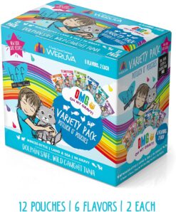 - Potluck O’ Pouches Variety Pack (2.8oz Pouches, Pack of 12) OMG, Six different flavors in one variety pack! Featuring premium proteins like tuna, chicken, salmon, beef, lamb and duck in a tasty gravy.