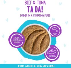 - Beef & Tuna Ta Da! (3oz Pouch, Pack of 12) Grass-fed Beef and red-meat tuna gently pureed into a creamy and delicious pate! Convenient Slide N’ Serve pouch makes feeding your BFF simple.