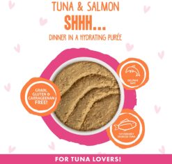 - Tuna & Salmon Shhh… (3oz Pouch, Pack of 12) Red-meat tuna and wild-caught salmon gently pureed into a creamy and delicious pate! Convenient Slide N’ Serve pouch makes feeding your BFF simple.