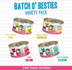- Batch ‘O Besties Variety Pack (3oz Can, Pack of 12) Is our batch o’ best selling all-natural B.F.F. wet cat food cans featuring Wild-caught Skipjack Tuna in a delicious gravy!