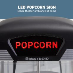 Enjoy movie-style popcorn at home with the West Bend Theater Crazy Popcorn Maker. This beautiful 4QT popper features an LED popcorn sign that adds a fun movie theater ambiance at home. Its whimsical movie theater styling and stir rod oil-popping technology let you bring a nostalgic and delightful snacking experience into your home. The easy-to-use magnetic kettle cover attaches to the top of the machine for easy filling and emptying. The one-touch kettle release effortlessly empties all popped popcorn into the unit. The popcorn maker offers easy clean-up with a removable kernel-catcher tray that filters unpopped kernels. ​The vintage-style popper includes a serving scoop, kernel measuring cup and oil measuring spoon. Ideal for game days, movie nights, parties and more, the West Bend Theater Crazy Popcorn Machine lets you enjoy fresh movie-style popcorn from the comfort of your home.