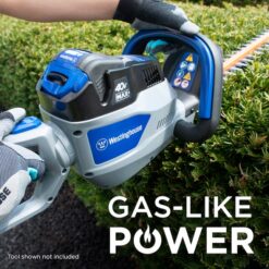 The Westinghouse 40VMAX+® Cordless Hedge Trimmer hacks the way to perfectly trimmed hedges for your home through premium lithium-ion technology powered by Samsung SDI™. Created with 24 in. dual-action blades that produce a 3/4 in. cut capacity, it carves through shrub overgrowth with ease. A lightweight and intuitive design allows for maximum range of motion with a 90° rotating handle to make shearing unwanted branches effortless. A wrap-around front locking handle combined with rubber grip rear handle provides ergonomics engineered for comfort and control. This trimmer sets the pace for an environmentally friendly alternative to traditional tools without the hassle of engine maintenance while still maintaining gas-like power. It comes with the Westinghouse 40VMAX+® Rapid Charge System which includes a 2.5 Ah lithium-ion battery and Rapid Charger which boasts shorter charge times and a longer battery life. With zero emissions and low tone, the 40VMAX+® Hedge Trimmer is the convenient go-to choice for easy yard maintenance.