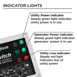 - Power indicator lights communicate whether the utility power is on/off and when generator power is on