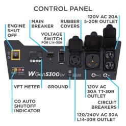 The Westinghouse WGen5300cv Portable Generator with CO Sensor is a convenient generator to keep you powered on the road or at your home during a power outage. With 6,600 peak watts and 5,300 running watts, this generator runs for up to 14.5 hours at a time with a 4.7 gallon (18 L) gasoline fuel tank. The WGen5300cv features a powerful 274cc 4-Stroke OHV Westinghouse Engine with a cast iron sleeve designed for durability, featuring a built-in fuel gauge and automatic low oil shutdown. It’s equipped with an RV Ready TT-30R 30A outlet that conveniently hooks to your travel trailer, keeping the air conditioner and travel necessities up and running all day long. Combined with an L14-30R outlet, it’s Transfer Switch Ready for total household power and eliminates the hassle for annoying extension cords or power strips for your home. The WGen5300cv is easy to use with an intuitive control panel that houses a 120/240 Volt Selector Switch to draw more power with added flexibility and a Digital Readout which displays real-time information to keep up with regularly scheduled maintenance. Engineered into a compact hardened-steel frame with added roll bars, foam grip handle, and never-flat wheels, it lets you easily move this generator from storage to use. The WGen5300cv Portable Generator is complete with a 3-Year Limited Warranty and Lifetime Technical Support, backed by our nationwide Westinghouse customer service and support network.