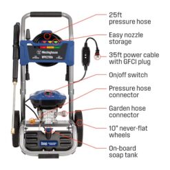 The Westinghouse WPX2700e is a 2700 PSI 1.76 GPM Electric Pressure Washer with the muscle to blast away grime from even your toughest cleaning jobs. Built with a high-performance induction motor, it’s meant for powerful heavy-duty cleaning. From a range of 5 nozzle tips, you can interchange the heads to suit your specific challenge of the day. Constructed with a handy 1.6L soap tank on its side, the WPX2700e is safe to use on brick, stone, concrete, wood, aluminum, and iron. With never-flat wheels that offer easy roll-away mobility, you can easily maneuver the pressure washer to get into hard to reach corners and scale across walls. Deep cleaning projects such as decks, sidewalks, siding, fences, railings, garage floors, exterior walls, cars, and patio furniture is easier than ever before.