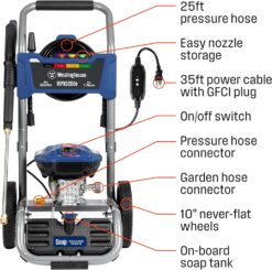 The Westinghouse WPX3200e 3200 PSI 1.76 GPM Electric Pressure Washer has the muscle to blast away grime from even your toughest cleaning jobs. Built with a high-performance induction motor, it’s meant for powerful heavy-duty cleaning. From a wide variety of 5 nozzle tips, you can interchange the heads to suit your specific challenge of the day. Constructed with a handy 1.6 L soap tank on its side, the WPX3200e is safe to use on brick, stone, concrete, wood, aluminum, and iron. With never-flat wheels that offer easy roll-away mobility, you can easily maneuver the pressure washer to get into hard to reach corners and scale across walls. Deep cleaning projects such as decks, sidewalks, siding, fences, railings, garage floors, exterior walls, cars, and patio furniture are easier than ever before.