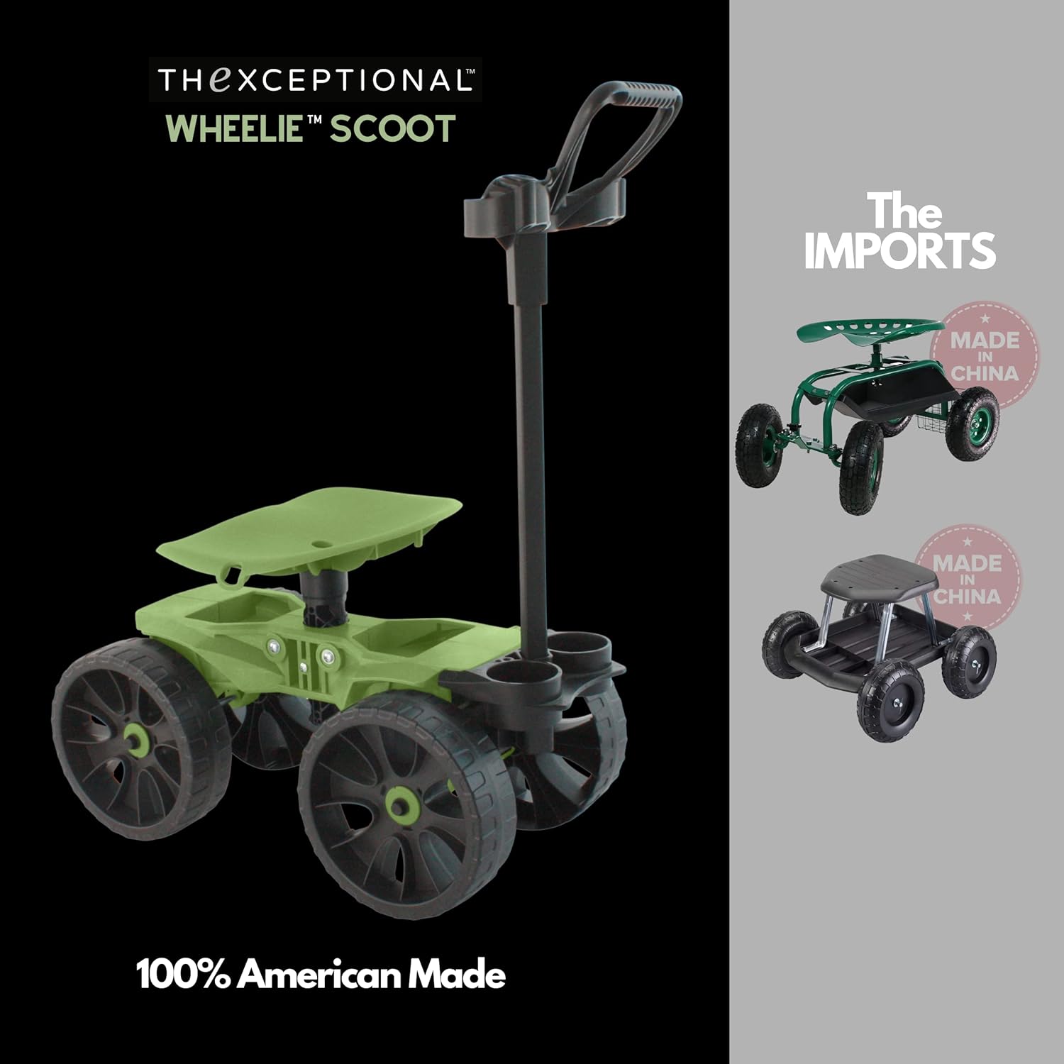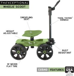 - HEAVY DUTY RUST RESISTANT DESIGN sprays off for easy clean up to assure a lifetime of use and durability. Rolling seat body is molded of premium polymer material and durable additive to enhance durability of the Wheelie Scoot rolling garden garage seat on wheels. Compare TheXceptional Wheelie to imports and its clearly the best rolling work utility seat. This decorative seat is good for older elderly and young. Garden cart scooter seat rolls to garden to help dig, plant, and do gardening.