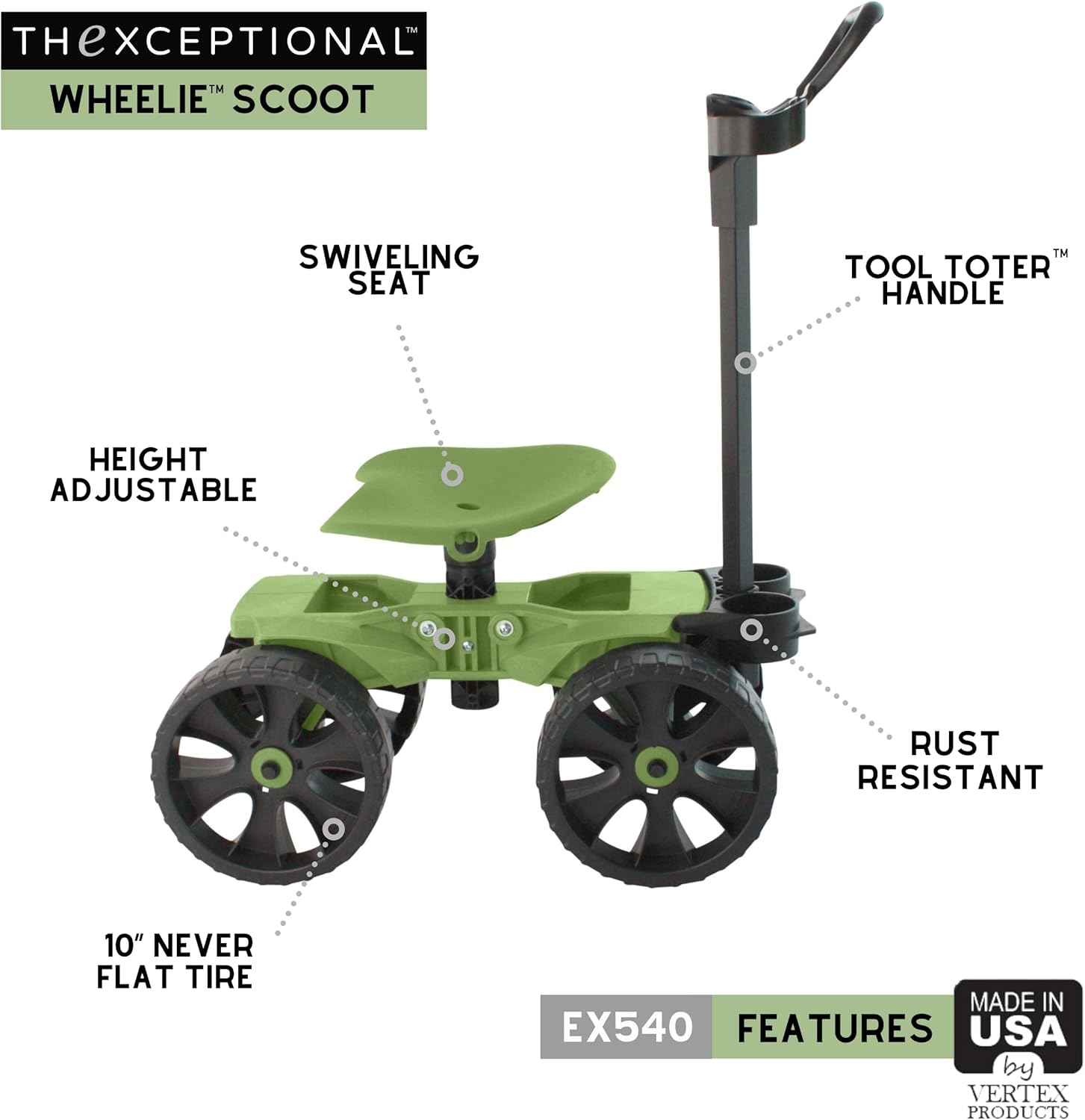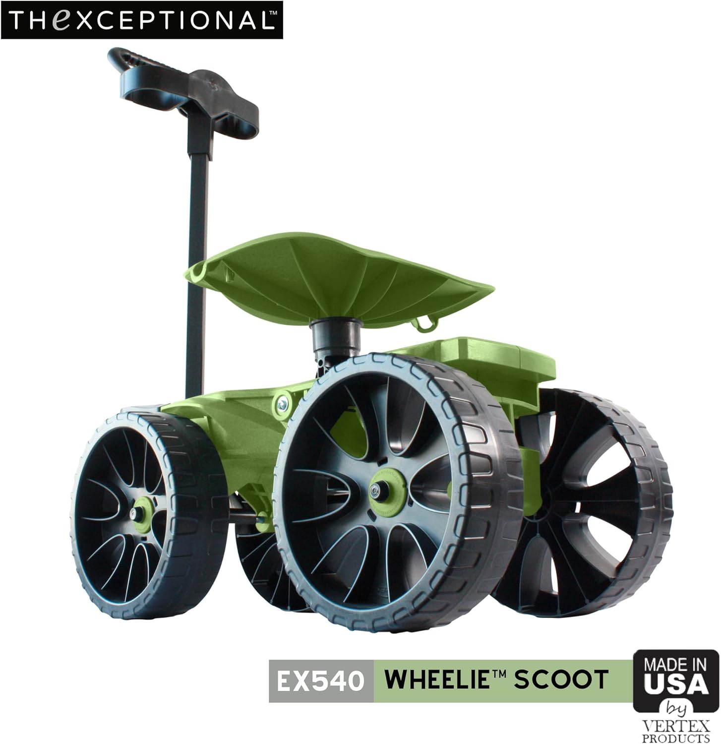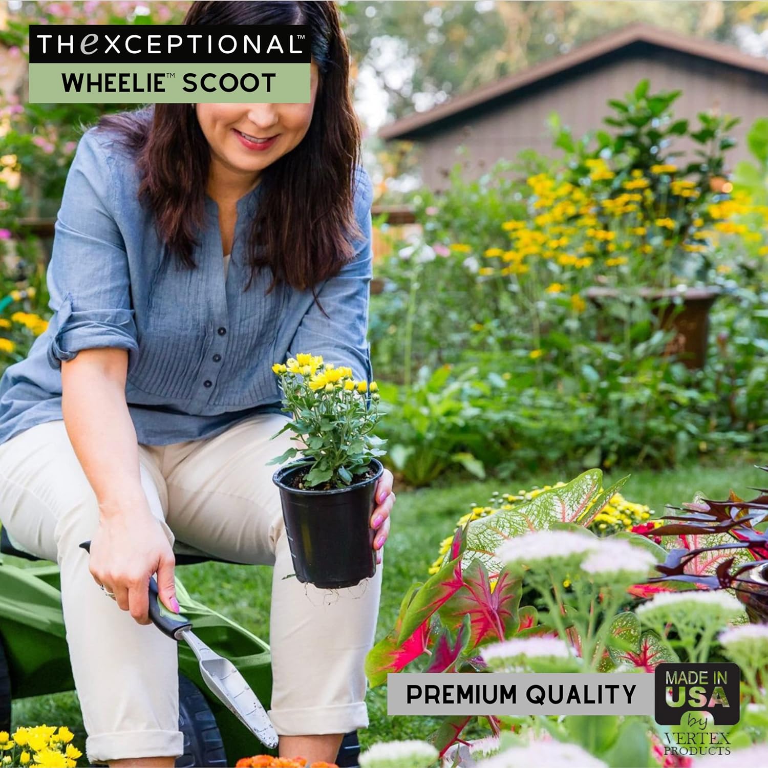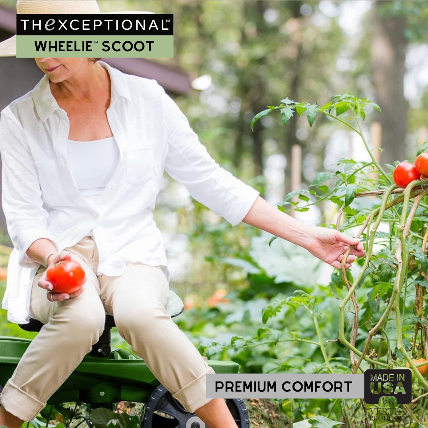 - 10 INCH NEVER FLAT TIRES never need air and are large enough wheels to roll over some of the roughest of terrain in the yard, garden, lawns and more. The Wheelie Scoot is a premium American made rolling garden cart with seat that is a excellent addition to your lawn and garden tools. Add it to your wagon or wheelbarrow or other Vertex Made gardeners gardening cart or scoot. Wheelie is great with rolling, yard cart, Lawn cart Wheelbarrow, wagon and other carts on wheels or rack.