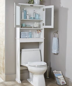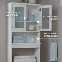The Better Homes & Gardens Harborough Bathroom Space Saver features plentiful storage, a clean white finish, frosted glass windows and chrome hardware. Its over the toilet design helps make the most out of limited bathroom space. The upper cabinet conceals two levels of storage. It has one adjustable shelf to help fit taller items. The doors are easy to open and close with smooth-glide hinges, and a latch ensures the doors stay shut once closed. The open shelf below is great for putting decorative items on display. Assembly is easy. Coordinate the over the toilet space saver with other pieces from the Harborough Bath Furniture Collection to give your bathroom a modern and functional look and feel.