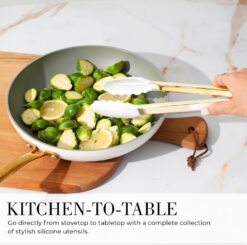 - HIGH QUALITY MEETS HIGH STYLE – white silicone and gold cooking utensils set for nonstick cookware combine the best of function and form; food-grade silicone is nonstick and BPA-free; also highly durable and resistant to cold and hot temperatures ranging from -22 Fahrenheit to 400 Fahrenheit, making these gold and white silicone cooking utensils set perfectly suited for all your kitchen needs and a perfect style to match with any gold and white kitchen decor or white kitchen accessories