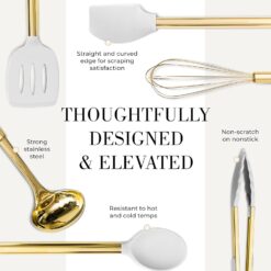 - REVITALIZE ANY COOK’S COUNTERTOP WITH THIS STUNNING WHITE AND GOLD SERVING UTENSILS —for any style-savvy cooks, foodies or bakers in your life, this unique and perfectly packaged set of white and gold serving utensils with matching gold utensil holder would be a welcome addition to any kitchen and a great gift for birthdays, housewarmings and weddings; make a match with our full line of gold kitchen accessories and gold kitchen decor and look no further for the perfect present again