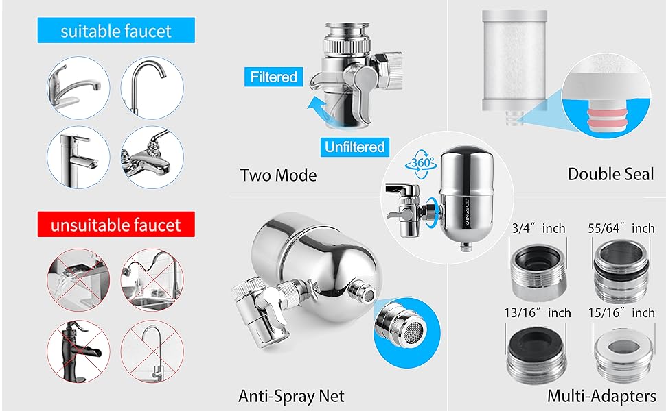 - [360°rotation & 2µm filtration]: freely-swiveling allows water output at any direction; Improve taste and reduce contaminants: chlorine, lead, fluoride, rust, dirt, sand, odor, smell, and particles up to 2µm;