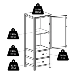 - Static weight capacity; top and shelves: 25lbs each, drawers: 20lbs each