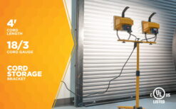 Designers Edge L13 1000-Watt Telescope Work Light with Telescoping Tripod Stand, 120-Volt. Twin head lamps rotate 360-degrees and fixture telescopes up to 42-inches tall. Tripod stand uses locking nuts requiring 1/4 turn for quick adjustments, 4-foot 18/3-gauge cord. All metal construction with hinged face and UV protected tempered safety glass. Shadow fighter grill reduces shadows, one weatherproof power switch per lamp for individual control. Includes (2) 500-watt Quartz Halogen Bulbs for up to 16,000-lumen output and cord storage bracket. Bright high-viz striped safety yellow extendable work lights produces 1000-watts of maximum power, rated at 120-volts. Integrated cord storage bracket on pole. UL and CUL Listed. TOLL FREE HOTLINE, 1-800-561-4321. If you have immediate questions about application, installation, troubleshooting, or a damaged component, please call CCI Consumer product hotline at 1-800-561-4321 or email questions to: CCI.ConsumerSupport@southwire.com. The Designers Edge (R) brand is a registered trademark of Coleman Cable Inc.