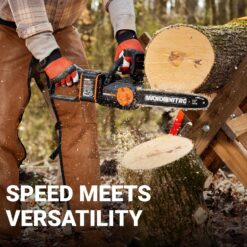 Tackle everyday cutting and trimming with confidence and convenience using the Worx Nitro 20V 12″ Cordless Chainsaw. Backed by a high-efficiency brushless motor, this supercharged 20V battery cuts up to 2X more powerfully to its predecessor (WG322), effortlessly slices through trees and branches up to 10″ in diameter without bogging down. Get more done in less time, as this battery operated chainsaw delivers rapid, productive cuts at up to 33 ft/s—2.6X that of the WG322 model. When used with a 4.0Ah Power Share PRO battery, this cordless chainsaw gets an extended runtime, allowing you to cut through up to 55 pcs of 4″x4″ hardwood on a single charge. Those same batteries can also be used with 140+ power tools, outdoor equipment, and various lifestyle products that are all part of the of the innovative, eco-friendly Power Share platform by Worx. With automatic lubrication, the chain stays perfectly oiled without you needing to worry about it, providing smooth and efficient cutting, while also prolonging the bar & chain life. Adjusting your battery powered chainsaw chain is just as easy. The tool-free chain tensioning and replacement system is designed to save you time and effort. Simply turn a knob clockwise to achieve perfect chain tension without overtightening. Or turn it counterclockwise to replace the chain without any need for tools. Bucking logs is a breeze with this 12″ battery chainsaw, thanks to its metal bucking spikes. They ensure smooth penetration into wood, boosting stability for secure and controlled cuts. Gain even more control and comfort on tough tasks with the soft-grip handle featuring rubberized microtexture. This electric chainsaw offers superior safety. Its quick-stop chain brake immediately springs into action if kickback occurs to help prevent injury. Plus, the added two-stage trigger prevents accidental starts, offering additional peace of mind.