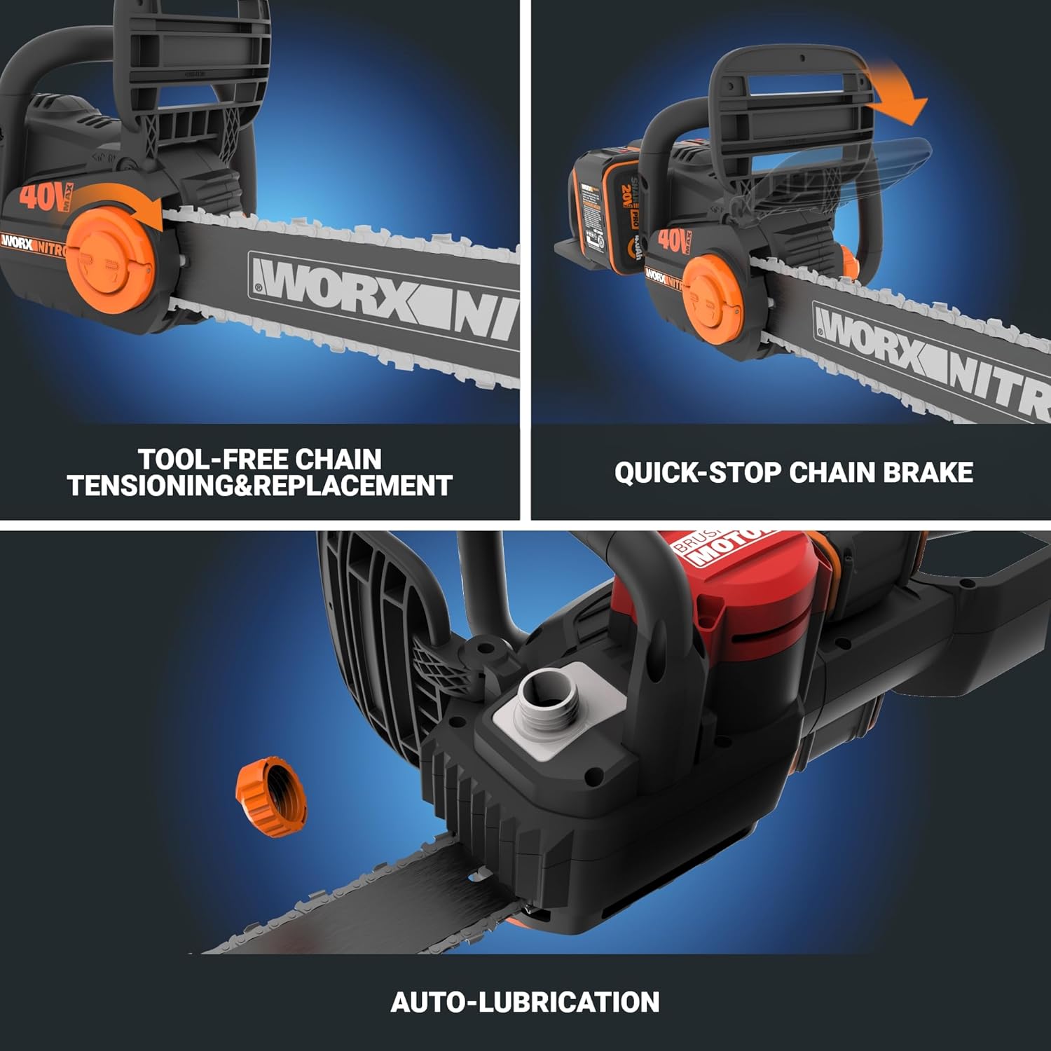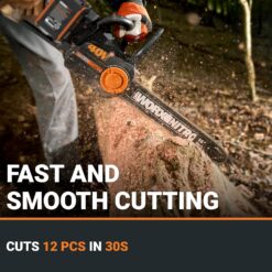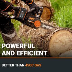 Cutting just got more powerful—and more convenient—with the Worx Nitro 40V Cordless 16″ Chainsaw. This chain saw delivers high-powered cutting without the need for gas—and the maintenance hassles and cost it carries. Whether you’re tackling everyday trimming or confidently slicing through dense hardwood, its high-performance 40V battery power ensures you don’t have to compromise on productivity. Adding to the cutting power is the cordless chainsaw’s high-efficiency brushless motor. Compared to brushed motors, it runs 50% longer, delivers 25% more power, and delivers a 10X longer life. The 40V battery chainsaw runs on Power Share PRO batteries, which are designed to optimize power and resist damage to increase runtime—so you can slice through 150 pcs of 4″x4″ hardwood on a single charge. Those same batteries can also be used with 140+ power tools, outdoor equipment, and various lifestyle products that are all part of the of the innovative, eco-friendly Power Share platform by Worx. Expect rapid, smooth cuts with this battery operated chainsaw. It delivers a 59 ft/s cutting speed—2X that of its predecessor. And with the chainsaw’s robust support of the brushless motor, heavy loads won’t shut the equipment down, so you can get more work done efficiently. With automatic lubrication, the chain stays perfectly oiled without you needing to worry about it, providing smooth and efficient cutting, while also prolonging the bar & chain life. Adjusting your battery powered chainsaw chain is just as easy. The tool-less chain tensioning and replacement system is designed to save you time and effort. Simply turn a knob clockwise to achieve perfect chain tension without overtightening. Or turn it counterclockwise to replace the chain without any need for tools. This chain saw doesn’t skimp on safety. Its quick-stop chain brake immediately springs into action if kickback occurs to help prevent injury. Plus, the added safety trigger lock prevents accidental starts, offering additional peace of mind.