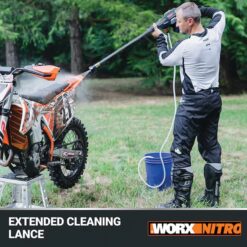 Optimize your outdoor and on-the-go cleaning experience with the Worx Nitro 40V Hydroshot Max Portable Power Cleaner. Built with the Brushless Motor 2.0, the cleaner delivers more power, longer runtime, and greater life than similar products that use a standard brushed motor or first-generation brushless motor. This extra power helps the power cleaner deliver 800 MAX PSI to effortlessly remove grime and spot clean within concentrated areas. Adjust the water force with two pressure settings for high- and low-pressure project needs. The power cleaner also delivers .92 MAX GPM to easily flush away debris from larger cleaning areas. With the Power Share battery, you can take this cordless power cleaner anywhere—a perfect solution for cleaning mid-size exterior surfaces, lawn furniture, campsites, boats, cars, RVs, ATVs, and outdoor features. The extended lance also allows for effective cleaning within tight or out-of-reach spaces. For added flexibility, rely on the 20-ft. quick-connect hose to draw water from any fresh water source—such as a bucket, lake, or pool. Maintain control of your work with the 5-in-1 multi-spray nozzle that can quickly switch between five spray settings: 0°, 15°, 25°, 40°, and Rinse. And for jobs that require extended work, rely on the ergonomic handle and easy on/off trigger to maintain constant, comfortable control of the water flow. Thanks to the quick-connect hose and snap-on nozzle functionality, cleaning, maintaining, and storing the power cleaner is a stress-free experience. To expand your cleaning capabilities, use the turbo nozzle connector to produce 360° of oscillating water power for more direct spot cleaning.