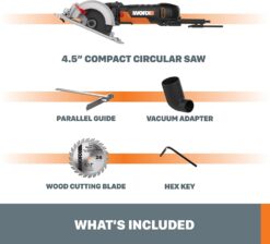 - [INCLUDES] 4.5” Compact Circular Saw, Wood Cutting Blade, Hex Key