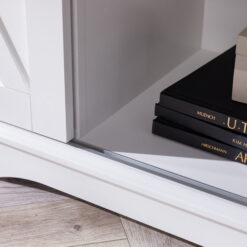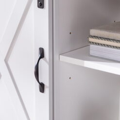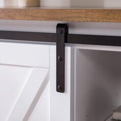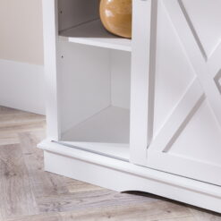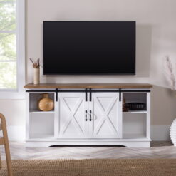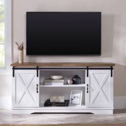 With a stand-out design, this 58 inch Sliding Farmhouse Barn Door TV Stand from Woven Paths will integrate style into your home. This TV stand will give your living room a charming country feel, while also providing plenty of storage space for your electronics and decor. Featuring two sliding barn door styled cabinet fronts for a versatile design where you can either close off the middle or both sides, depending on your needs. Adjustable shelving and cable management make it simple for you to keep your electronics in one place. This media console is constructed of high-grade MDF. The modern farmhouse style of this entertainment center will become a piece in your living room you’ll admire.
