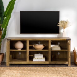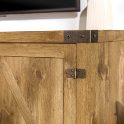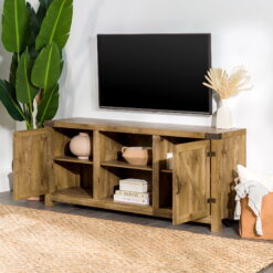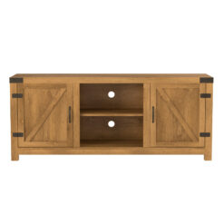 Offer up extra storage space in your home with this Modern Farmhouse Barn Door TV Stand from Woven Paths. Include our rustic barn door style TV stand in your home to not only enhance the decor of your living area, but create ample storage for all of your media, accessories, and more. This entertainment center is made of durable, high-grade MDF and can support most TVs up to 65 inches. As a storage console, it will keep your living room looking neat while also giving it a homespun feel. This barn door TV stand in your living room will bring a charming, country feel. Features concealed storage space behind the barn-styled side doors with adjustable shelving to fit your media and accessories, while having a mix of rustic and modern farmhouse style. It’s the perfect addition that will keep your living room looking neat and give it a homespun feel. (Dimensions: 58 inch W x 16″ D x 24″ H; Weight: 87 lbs.)