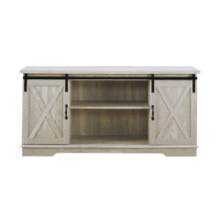 Get style and storage with the Woven Paths Farmhouse Barn Door TV Stand. Sliding barn doors on the cabinet create a customizable storage experience and can hide any of the three adjustable shelves. Position the sliding doors in the center or sides to display or hide your media, electronics, accessories, glassware, or decor on the shelves and use the cord management holes to keep cables organized and tidy. Thanks to the high-quality, durable materials used to make this stand, you can rest assured you’ll have it for years to come. Add the Woven Paths Farmhouse Barn Door TV Stand to your collection today.