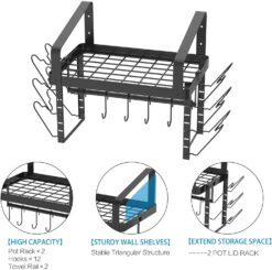 - 【Large Storage Capacity】– Set of 2 pan organizer with 12 removable hooks ,there is enough storage place for even the most enthusiastic culinary lovers.2 large grid shelf measuring make you can store and display all your favorite cookwares on the racks,and hang the pots and pans by hooks.