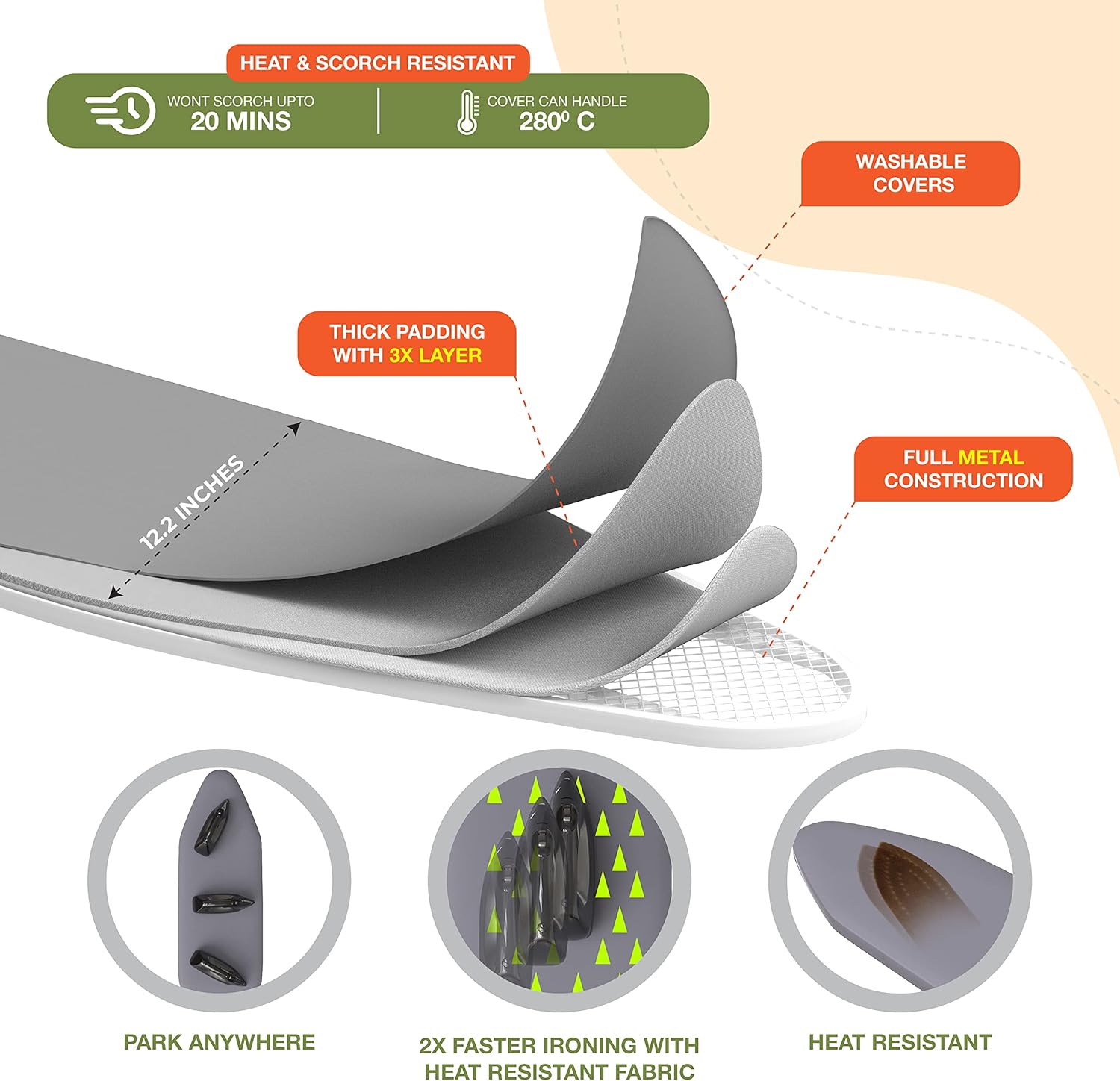 - STEAM / ELECTRIC IRON FRIENDLY: Professional machined perforated steel tabletop allows steam to escape faster aiding wrinkle removal and a sturdy ironing surface. The cotton ironing board cover and pad is non reactive to iron your expensive clothes reducing damage due to pigment transfer